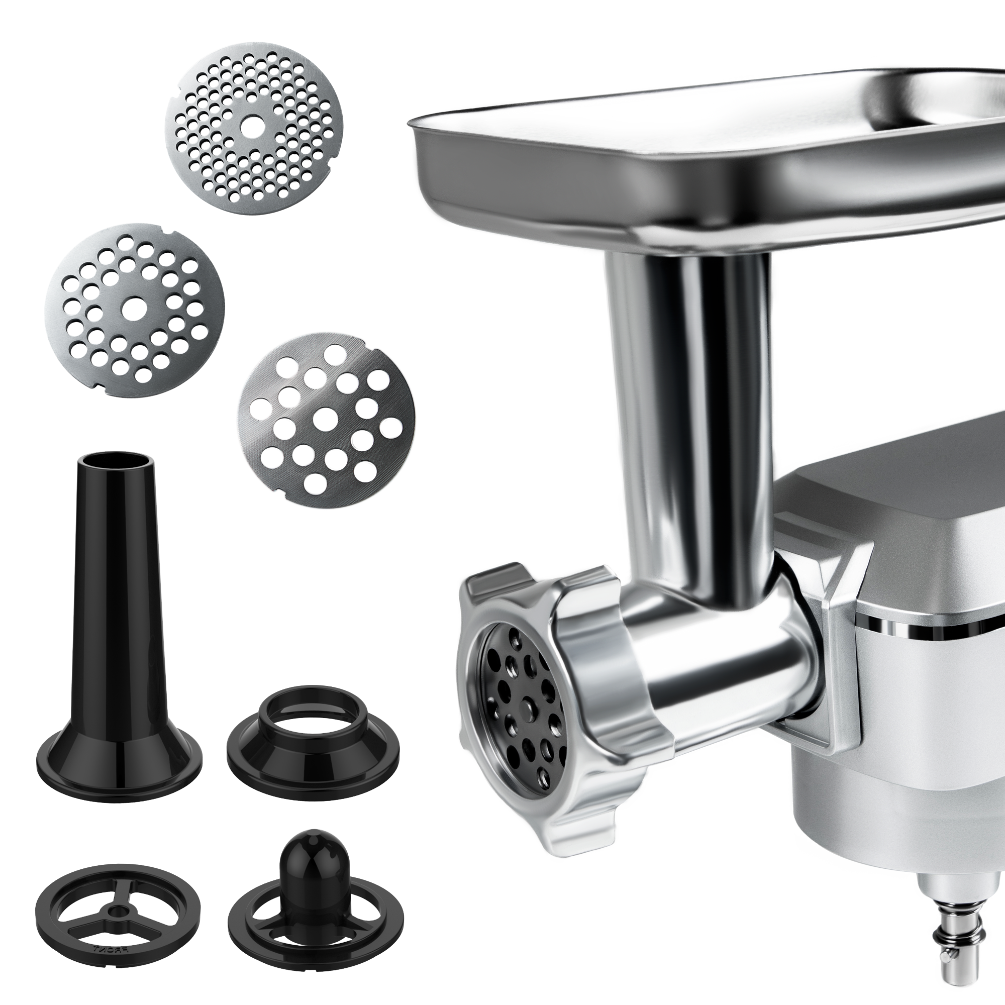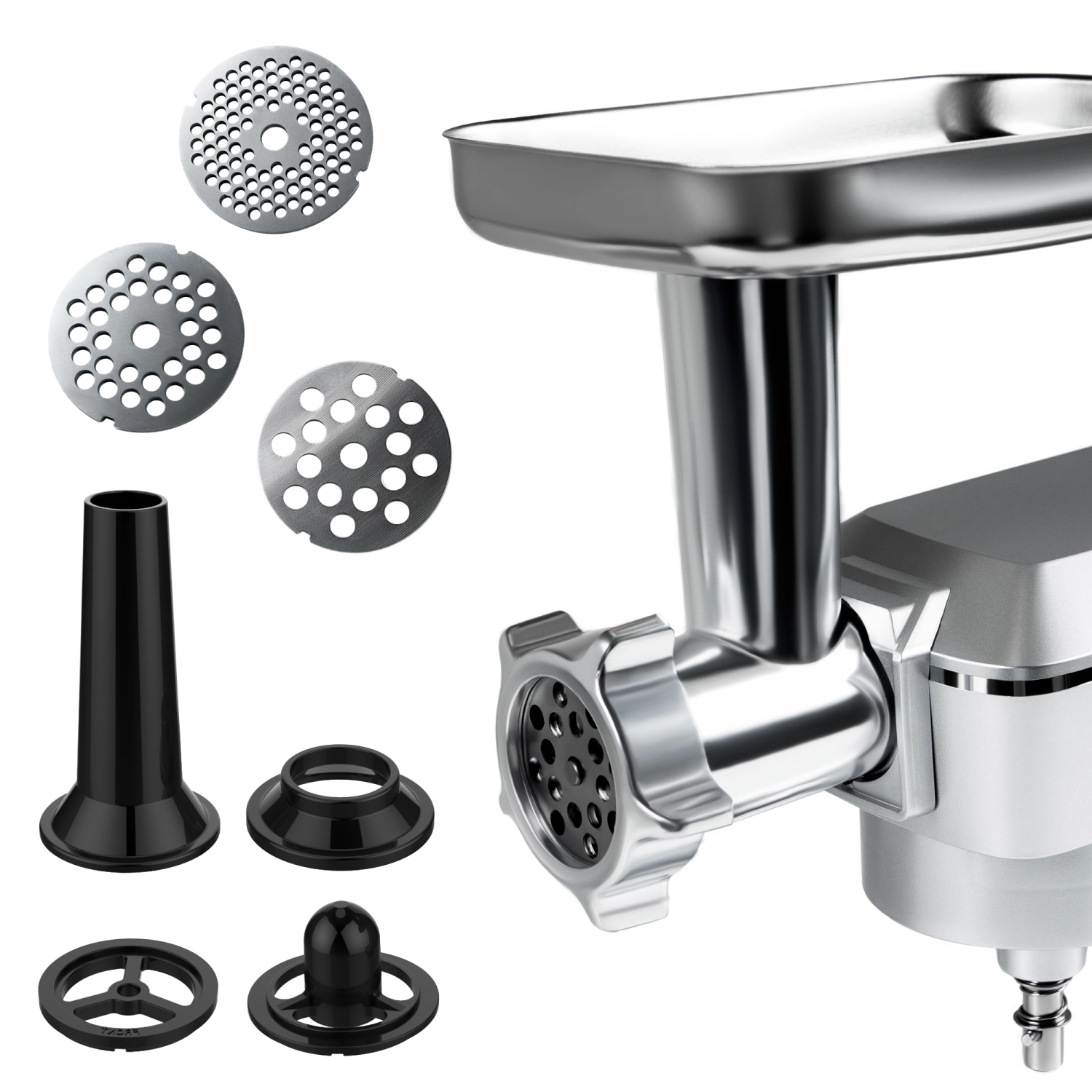 Включает 5 насадок, которые позволяют готовить фарш для котлет, домашние колбасы и сосиски, а также различные начинки и паштеты.
