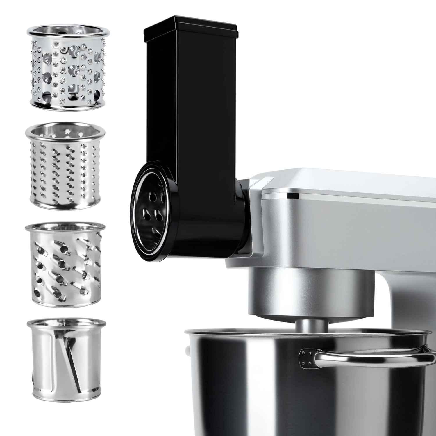 Набор включает 4 насадки, предназначенные для быстрой и удобной нарезки овощей и фруктов на ломтики, кубики, соломку, крупную или мелкую терку