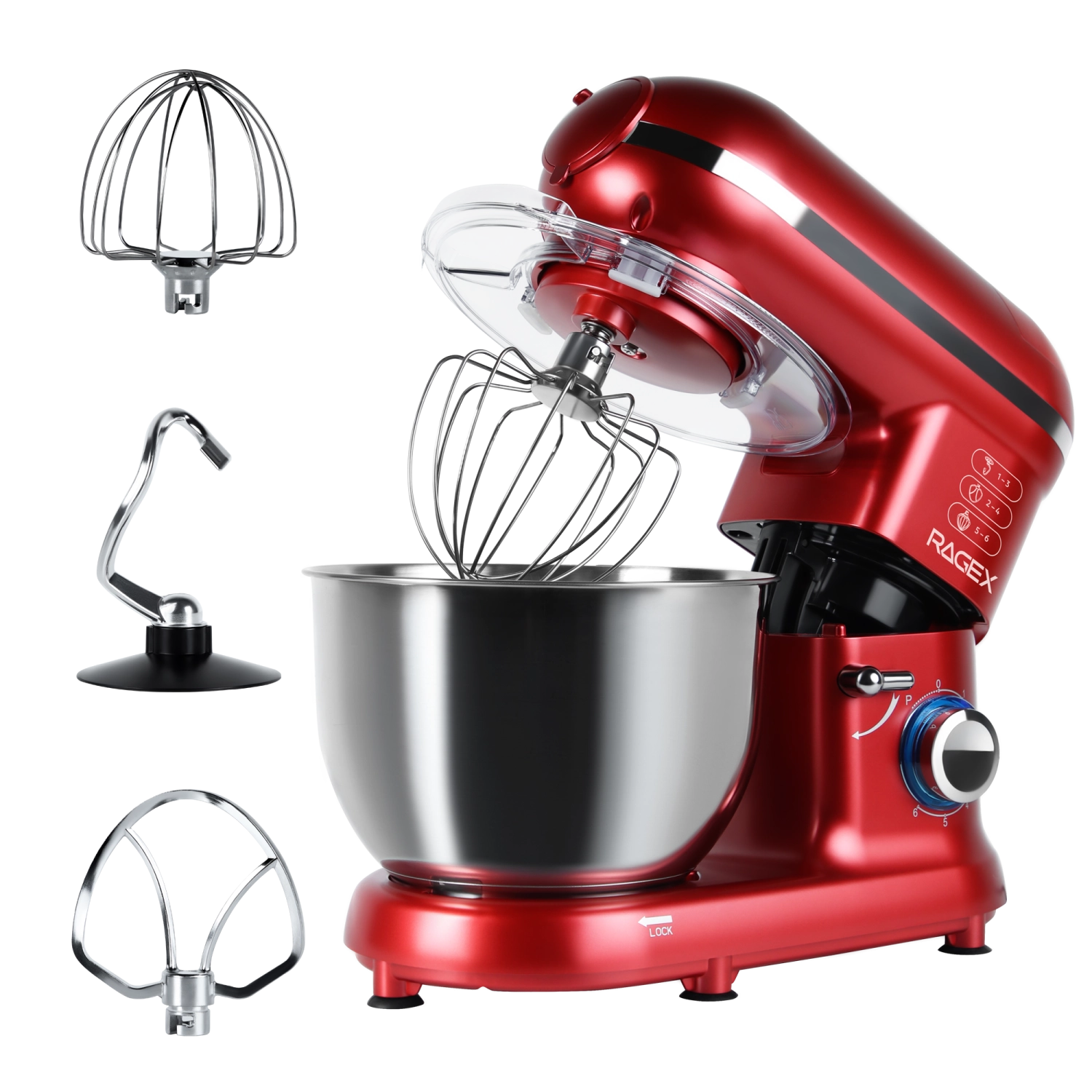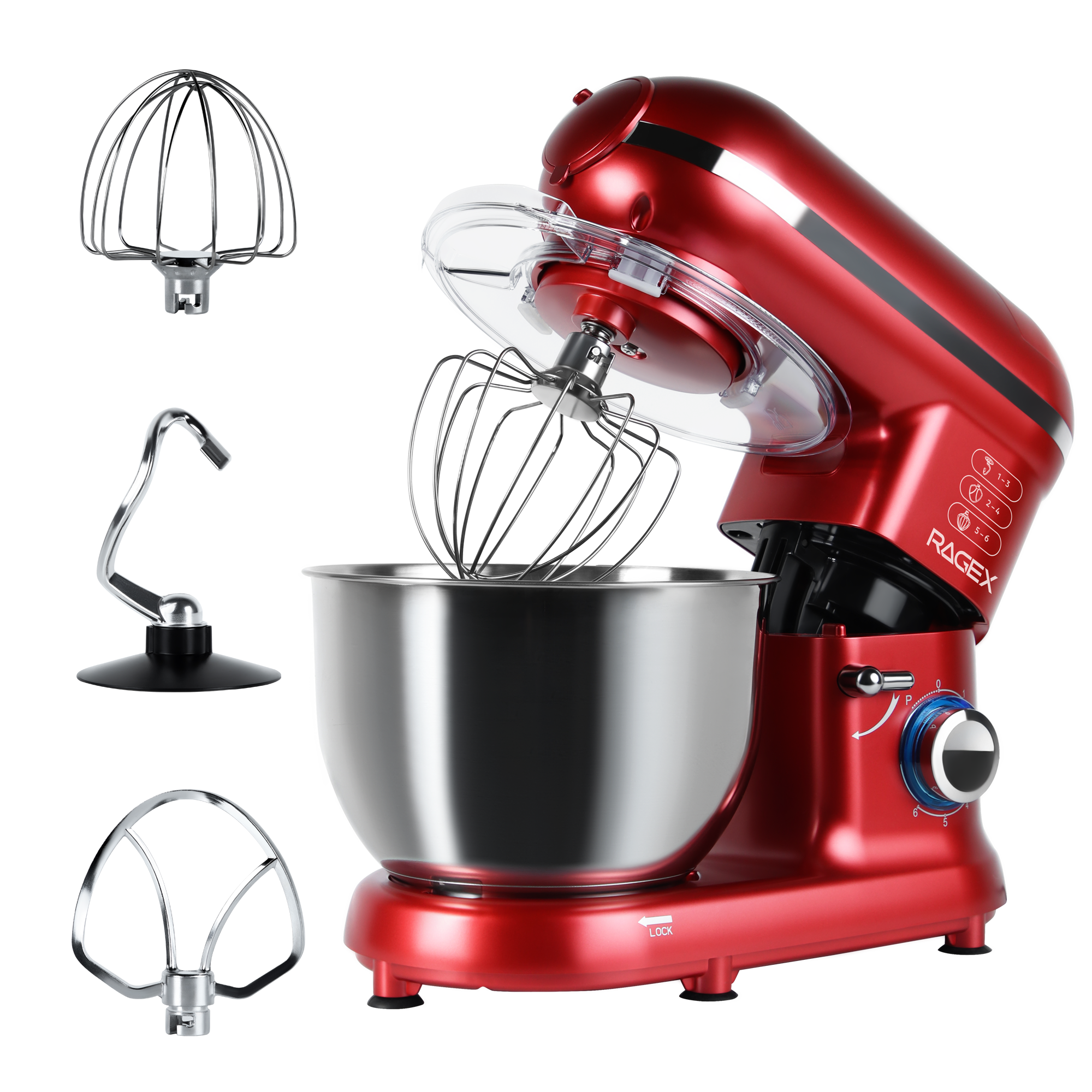 В комплект входят крюк для теста, плоский битер и венчик для взбивания, смешивания и замешивания теста