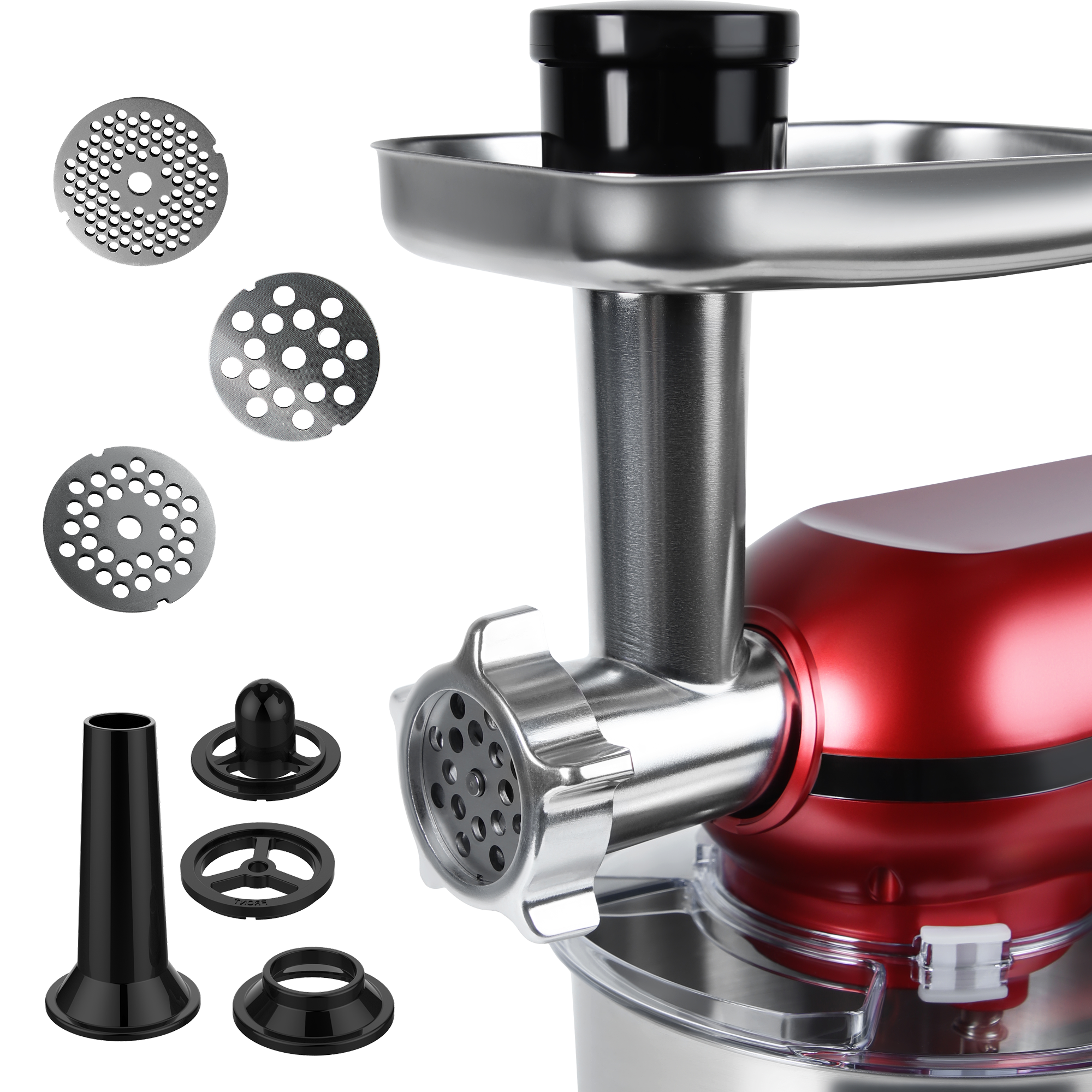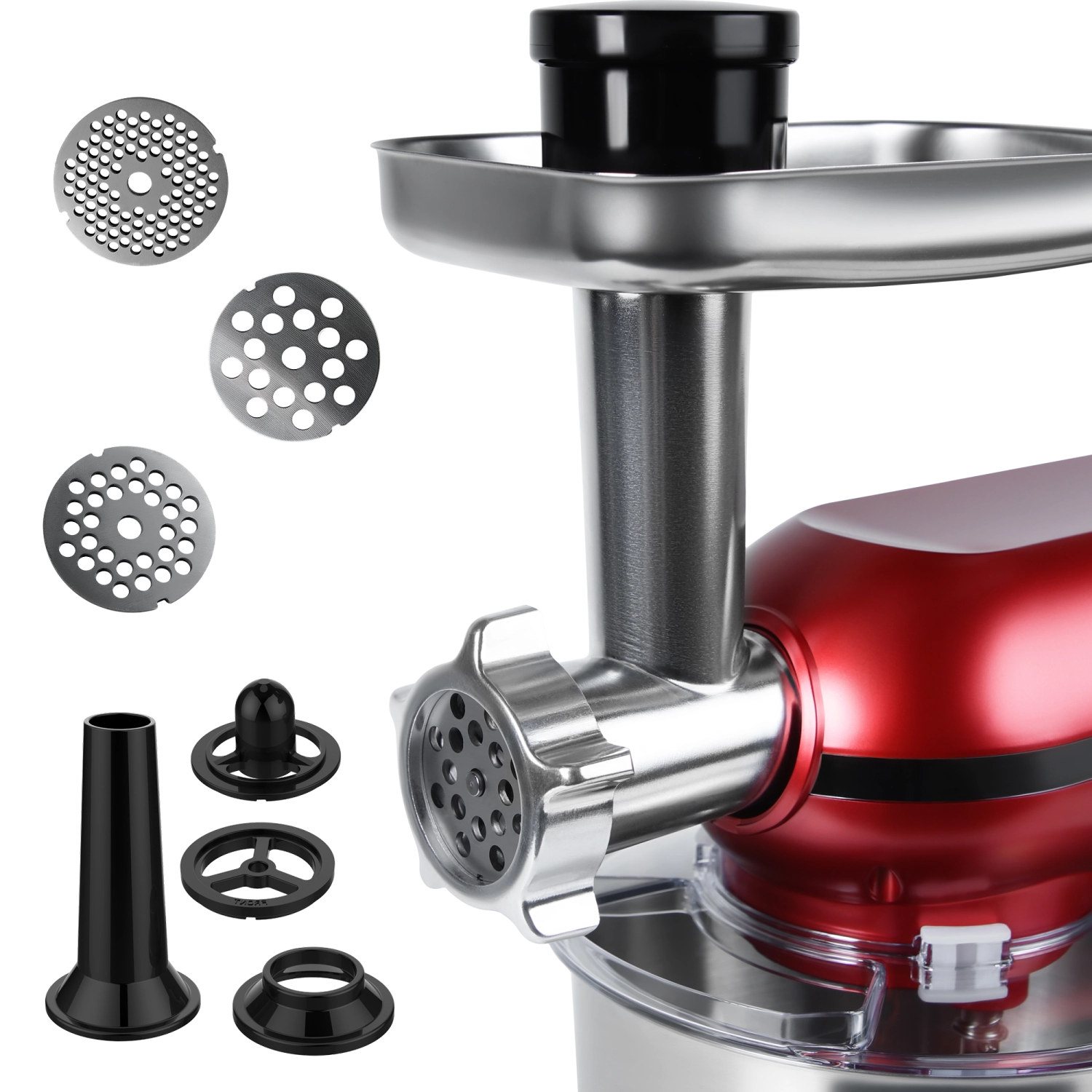 Включает 5 насадок, которые позволяют готовить фарш для котлет, домашние колбасы и сосиски, а также различные начинки и паштеты.