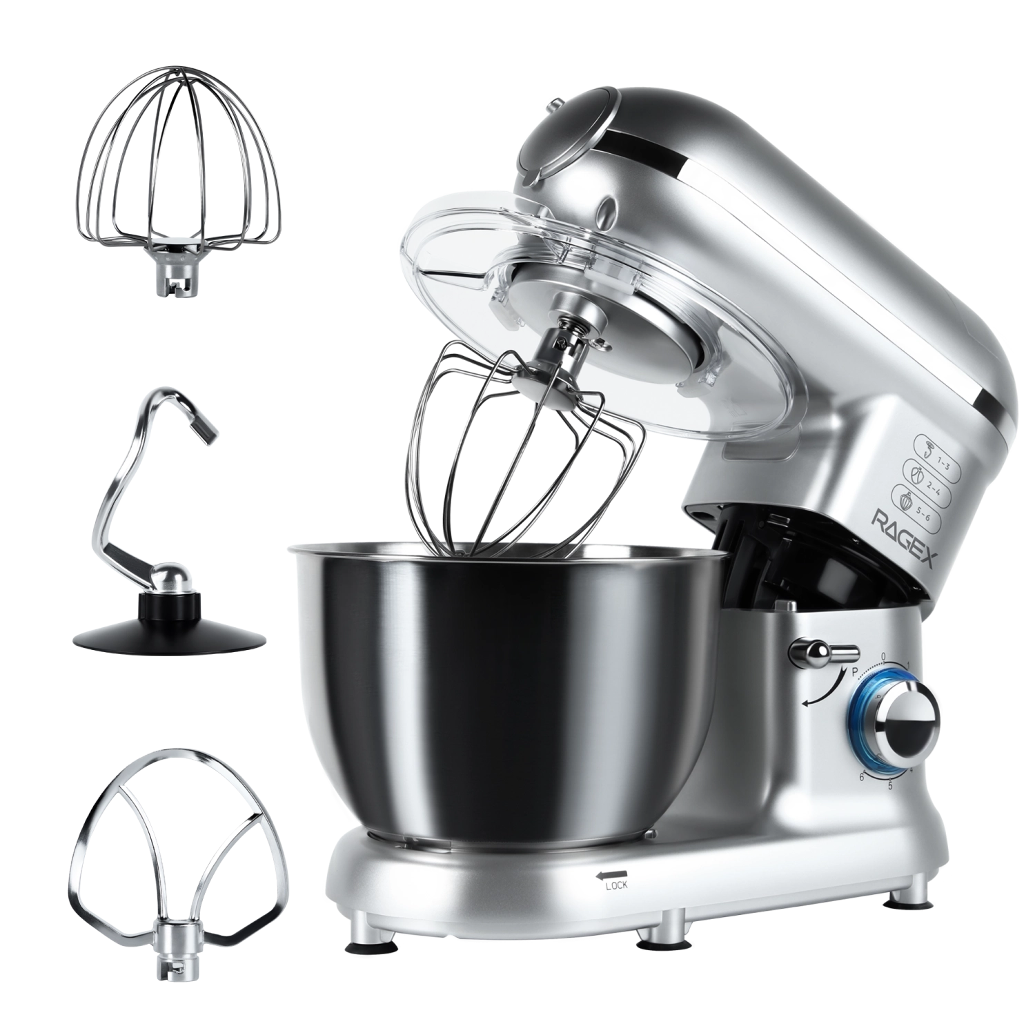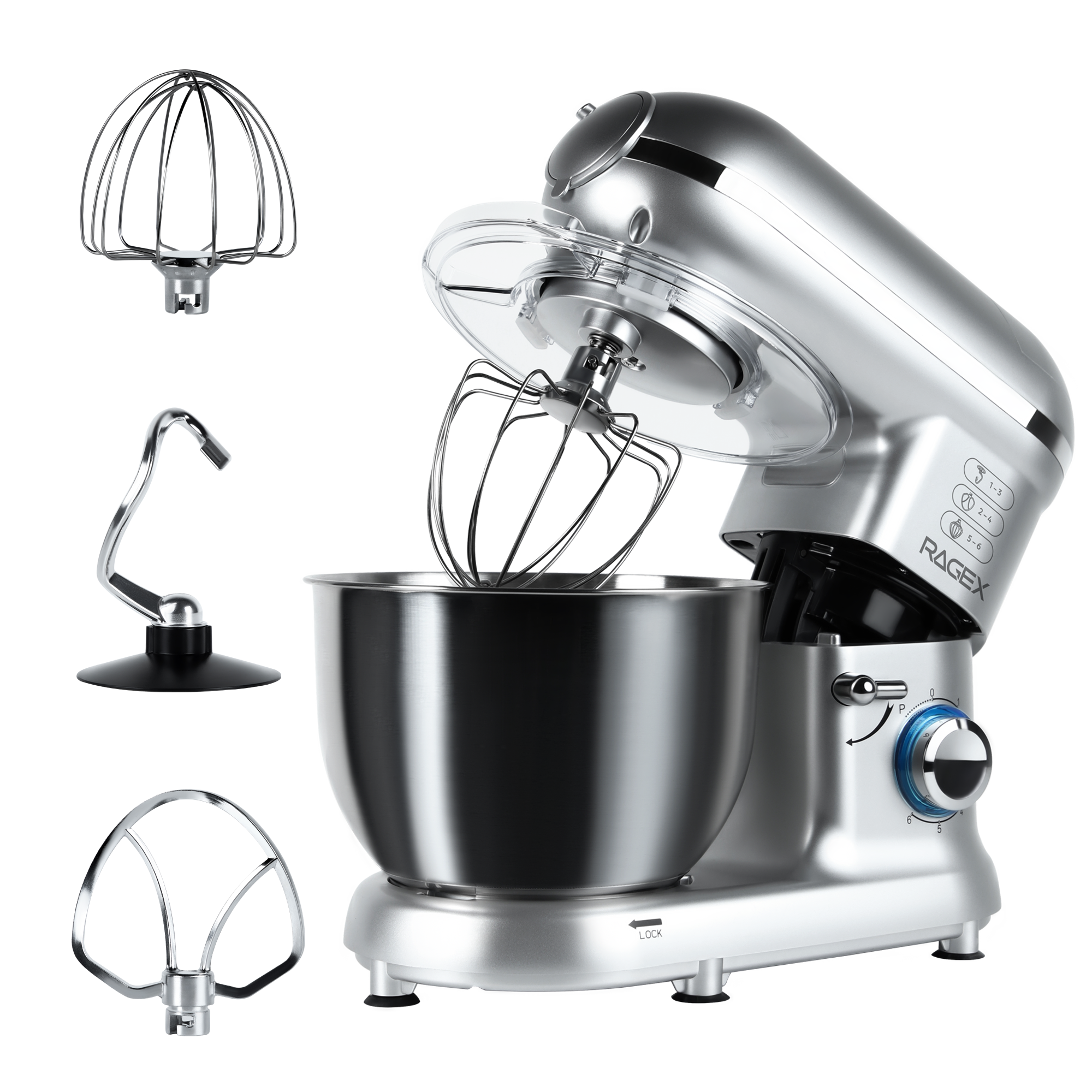 В комплект входят крюк для теста, плоский битер и венчик для взбивания, смешивания и замешивания теста