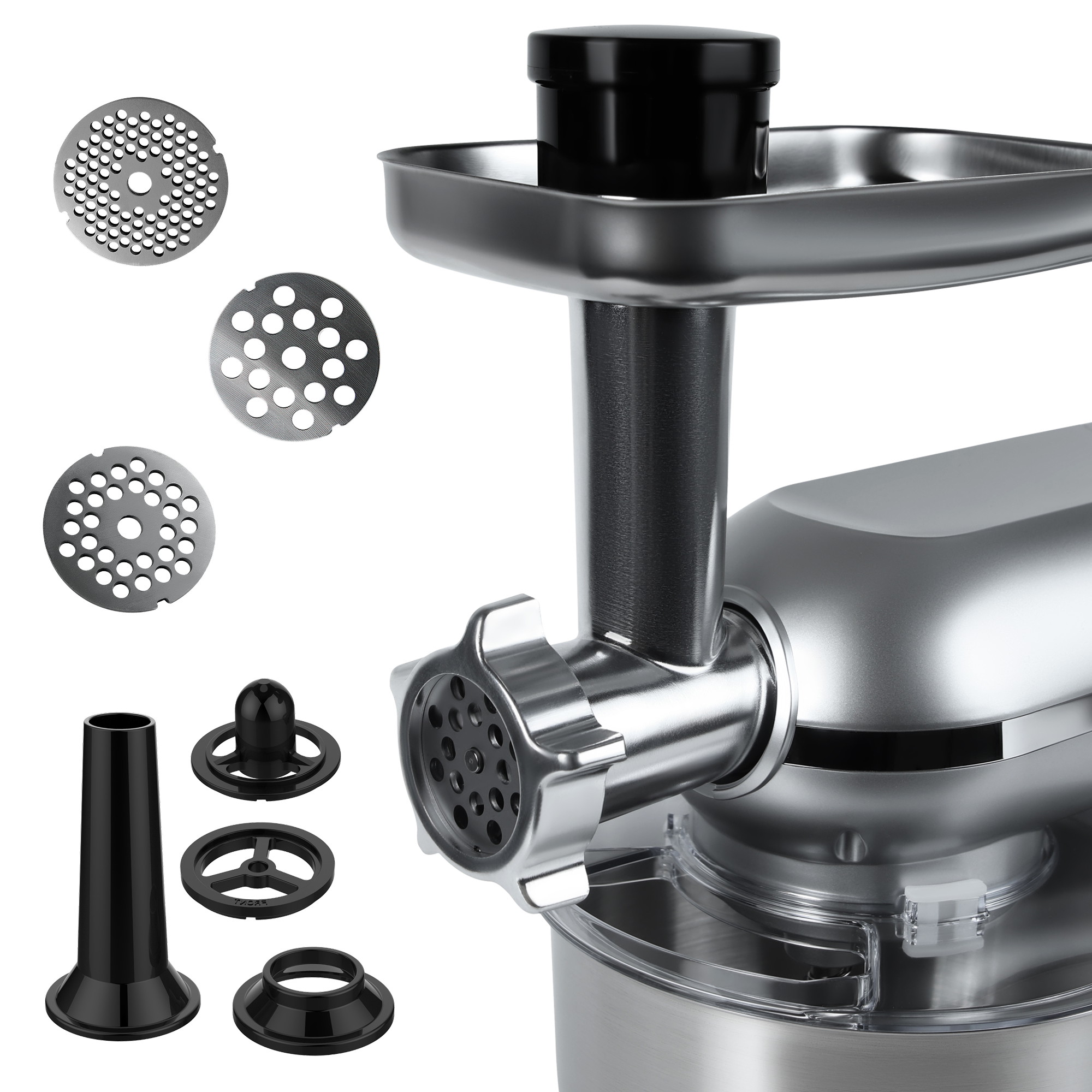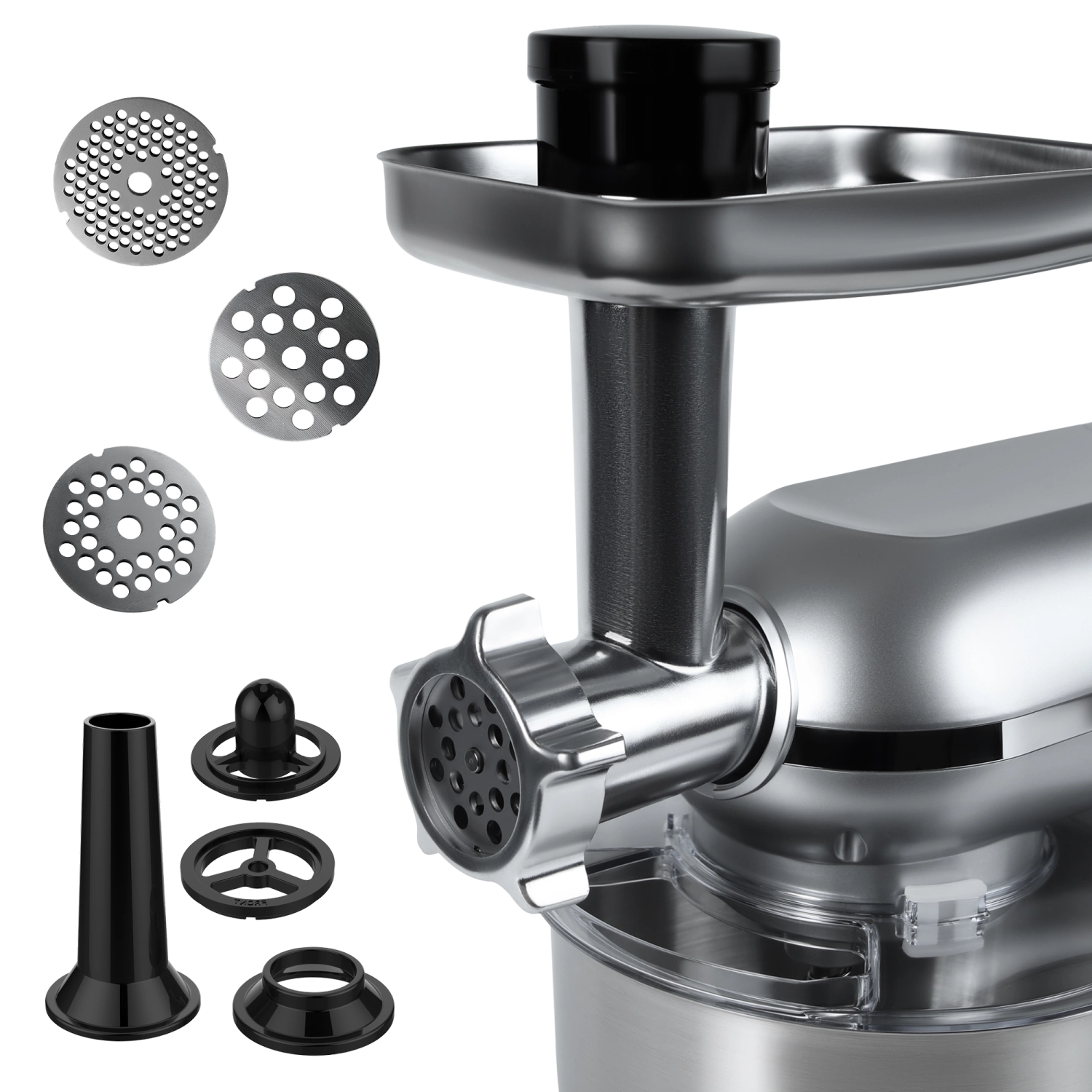 Включает 5 насадок, которые позволяют готовить фарш для котлет, домашние колбасы и сосиски, а также различные начинки и паштеты.