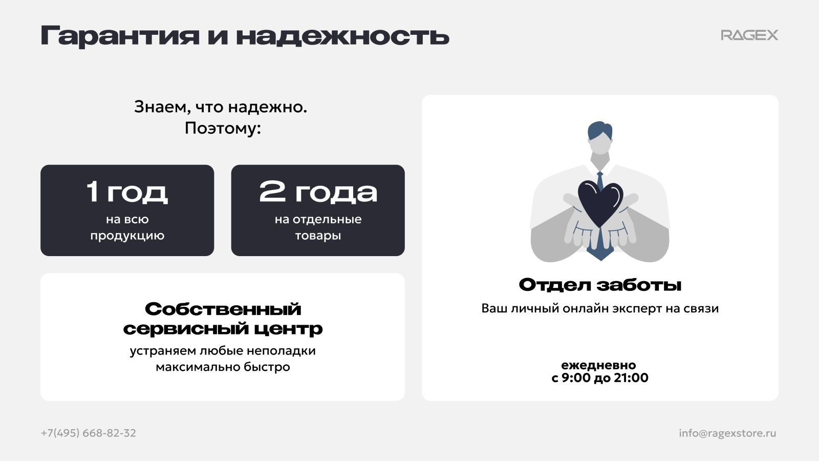Для решения гарантийных вопросов обращайтесь на нашу почту care@ragexstore.by или по номеру телефона +375(25)601-87-77.